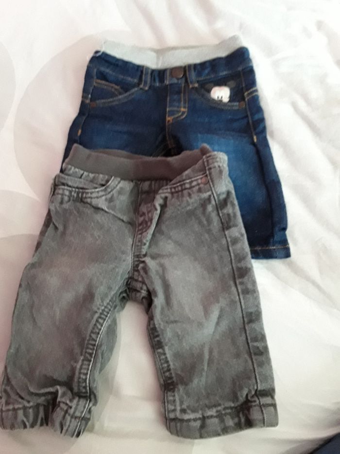 Lot de 2 jeans pour bébé 1 Jean gris foncé 1 Jean bleu foncé avec dessin Marque Disney et kiabi Exellent état Taille 3 mois