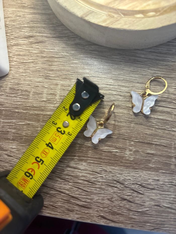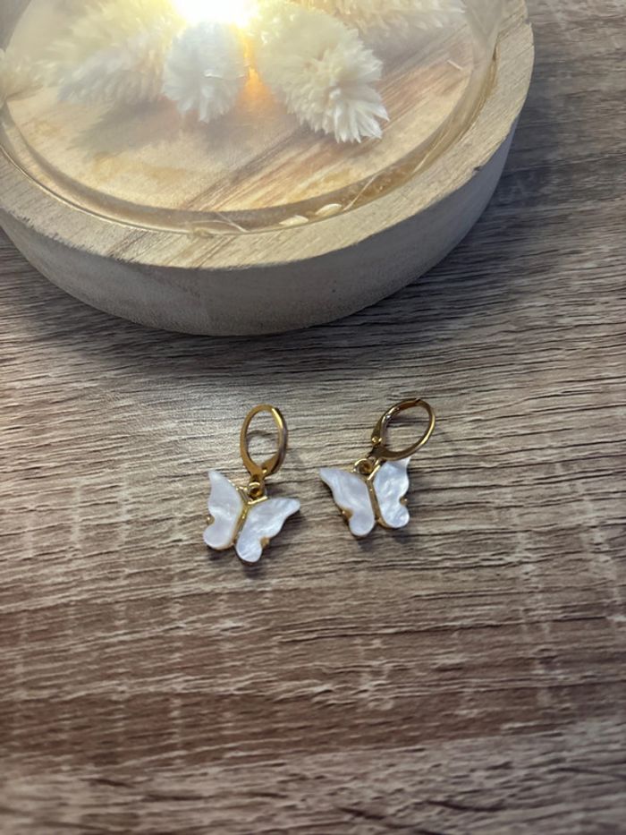 Boucle d’oreille papillon blanc et doré jamais porté Photo prise sur un meuble