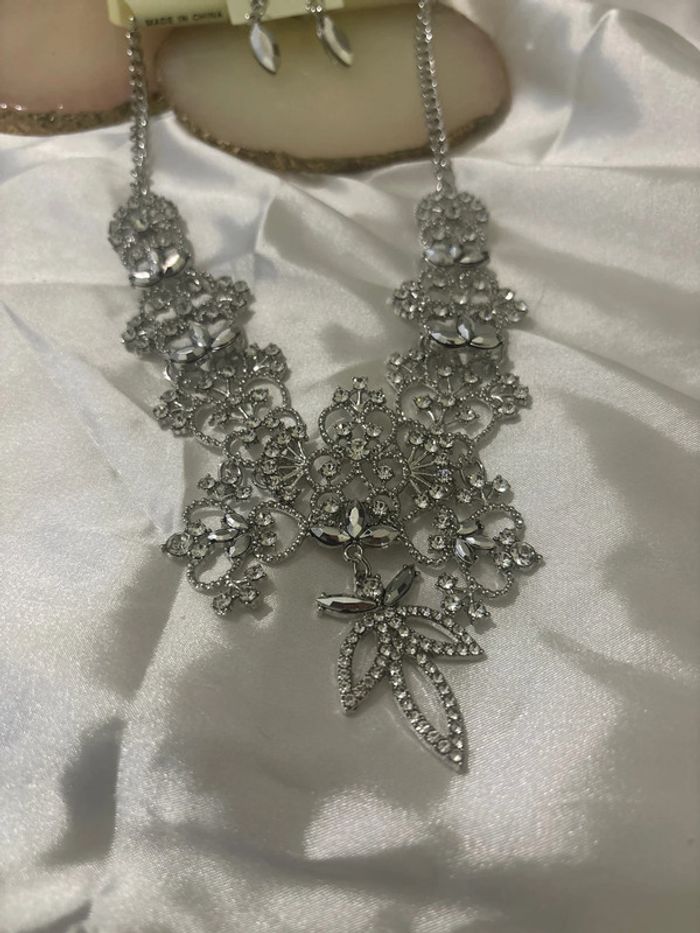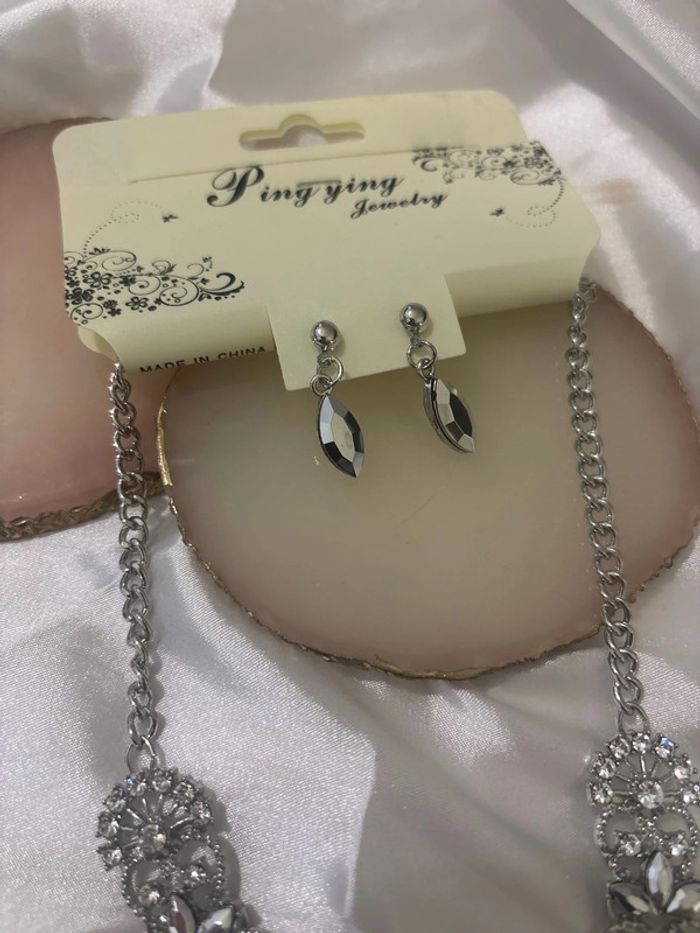 Parure collier et boucles d’oreilles argenté avec strass jamais porté