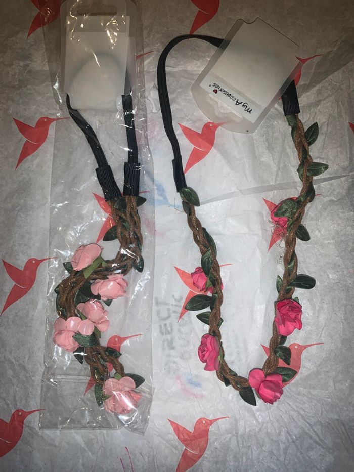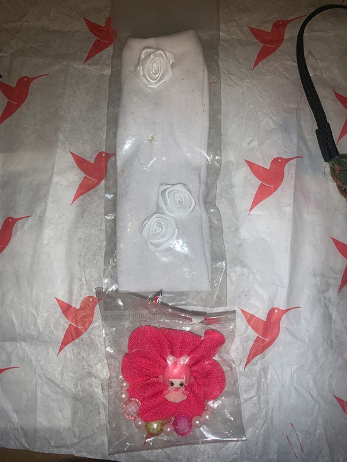 Lot neuf 2 élastiques tête motif fleurs , rose foncé et rose clair 1 élastique avec petite fée fleur 1 pince fils de perle 1 mini bandeau blanc , bébé ou poupée + petites choses offertes #lot,accessoire,cheveux,fille,bebe#