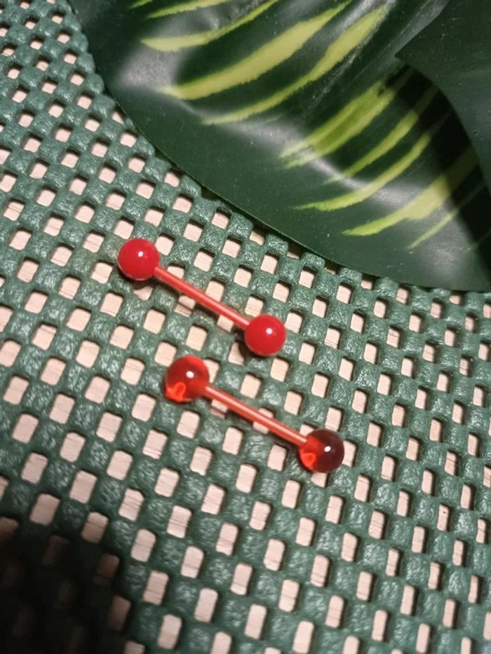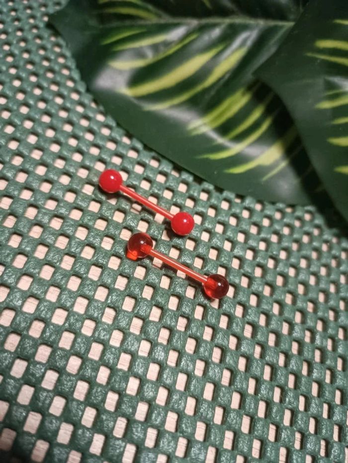 🔸Lots de 2 piercings langue avec barre en plastique chirurgical (Idéale pour les examen médical) : -un transparent rouge -un rouge. Jamais utilisé, Neuf.🔸 #Justeeuxbijoux 🔸Envoi rapide et soigné, colis fragile bien protégé. 🔸 🔸Toujours avec petit cadeau aléatoire.🔸 🔸Réduction Jusqu’à 15% activé en Lot. N'hésitez a venir faire un tour dans mon dressing 🤗🔸