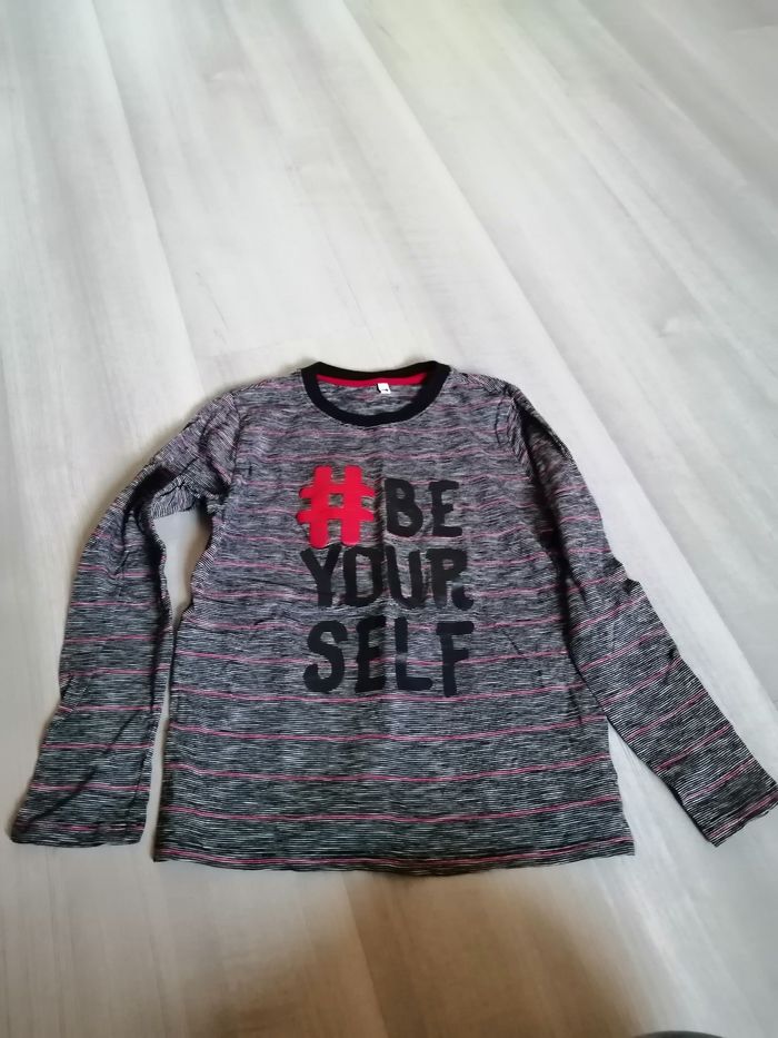 Je vends un tee shirts manches longues gris à petites rayures noires. Taille 10 ans. Très bon état Maison non fumeur Envoi rapide et soigné