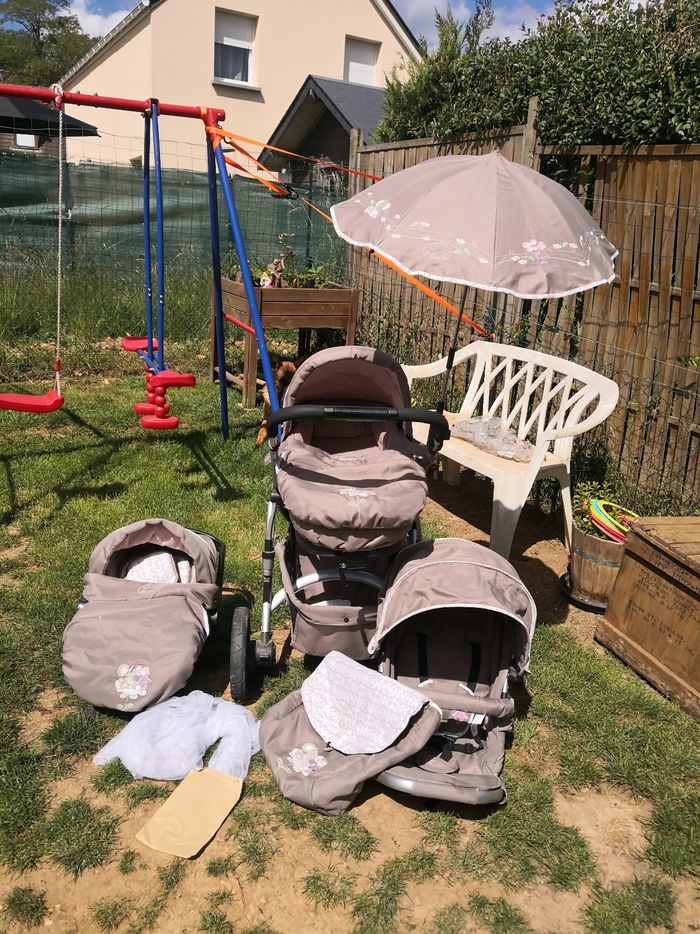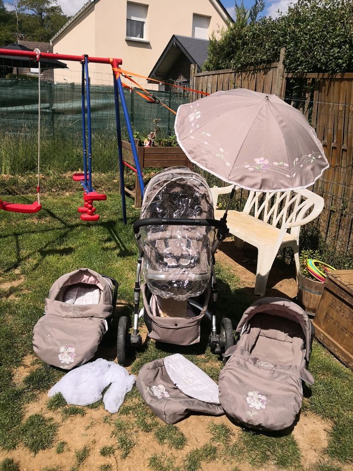 Poussette de la marque Noukies 3 en 1, elle est en bon état, juste 2 petits défauts (voir photo) décousu à un endroit et manque capuchon sur l'ombrelle. Les housses sont démontable, réversible et lavable en machine. Elle a aussi un habillage de pluie et une moustiquaire.