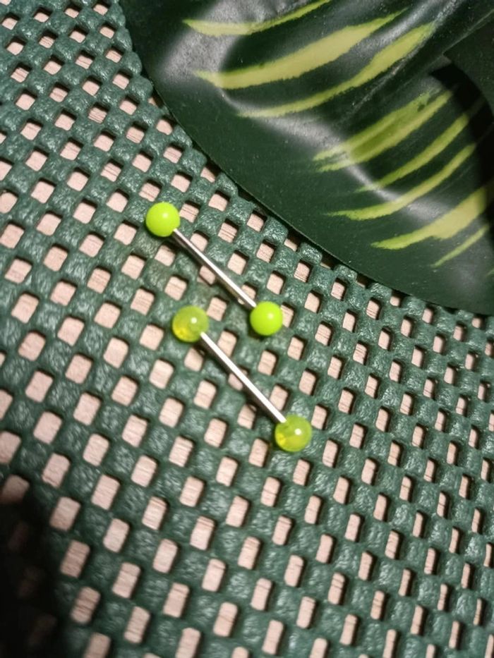 🔸Lots de 2 piercings langue avec barre en acier chirurgical : -un jaune fluo -un transparent jaune. Jamais utilisé, Neuf.🔸 #Justeeuxbijoux 🔸Envoi rapide et soigné, colis fragile bien protégé. 🔸 🔸Toujours avec petit cadeau aléatoire.🔸 🔸Réduction Jusqu’à 15% activé en Lot. N'hésitez a venir faire un tour dans mon dressing 🤗🔸