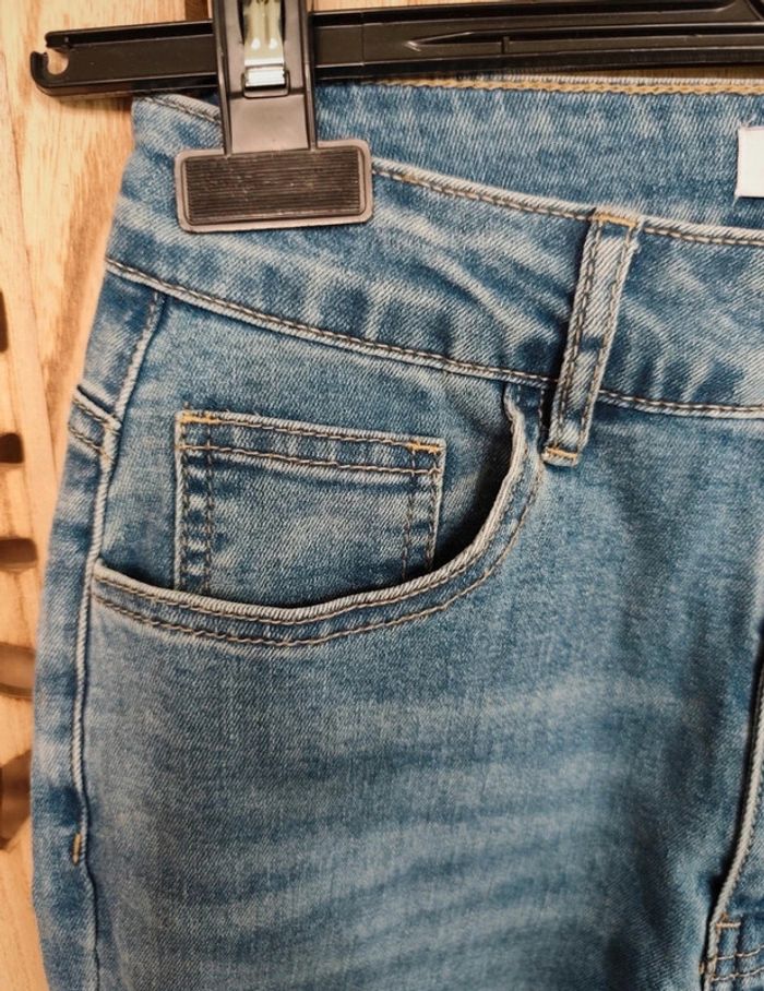 Jean skinny moustache, bas coupés 5 poches fermeture éclair et un bouton pour les grandes de + personnes de + 1 m80 Taille XS/34 Taille à plat : 30 extensible jusqu'à 36 cm Matière : 70 % coton, 29 % polyester, 1 % spandex Entrejambe : 92 cm Bas du jean :18 cm