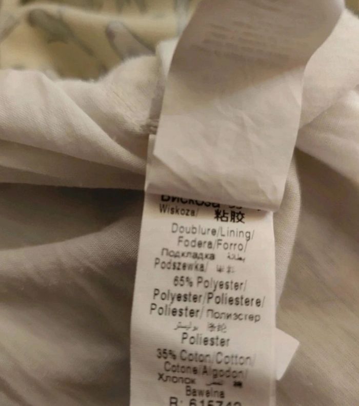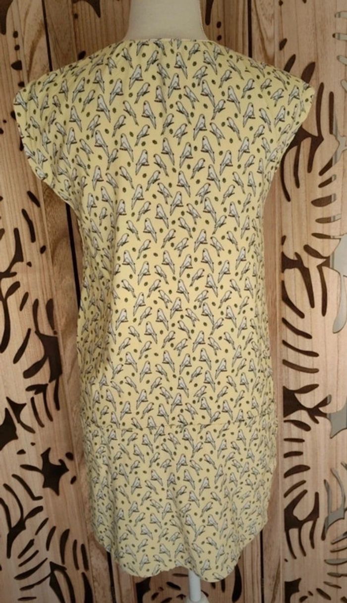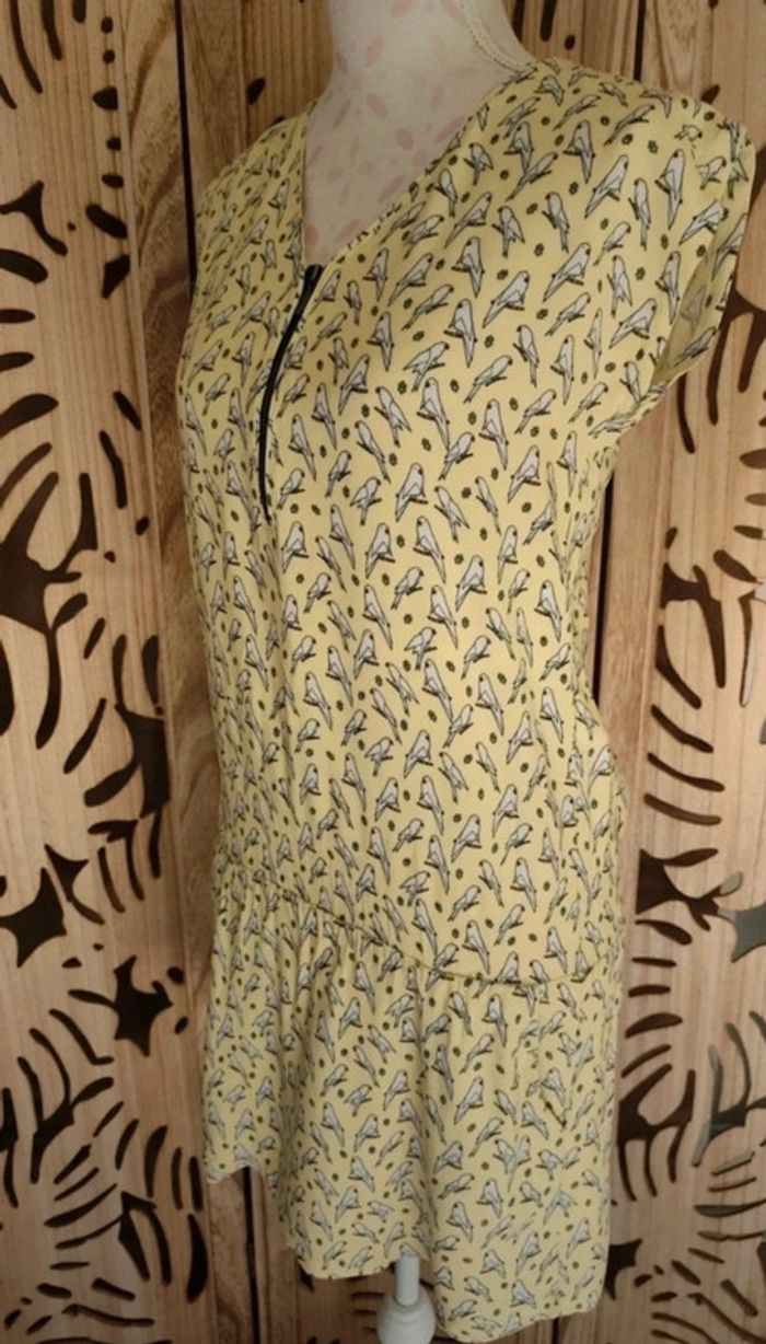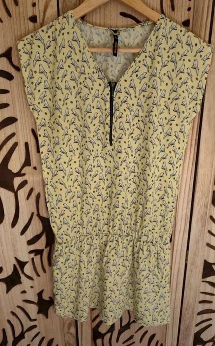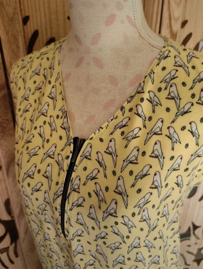 Robe imprimé jaune clair perroquet Doublure à partir de la taille ,fermeture éclair décolleté, élastique au niveau du bassin 2 poches sur les côtés Taille XS/34 Aisselle à aisselle à plat : 46 cm Matière : 100 % viscose, doublure : 65 % polyester, 35 % coton Longueur robe : 85cm