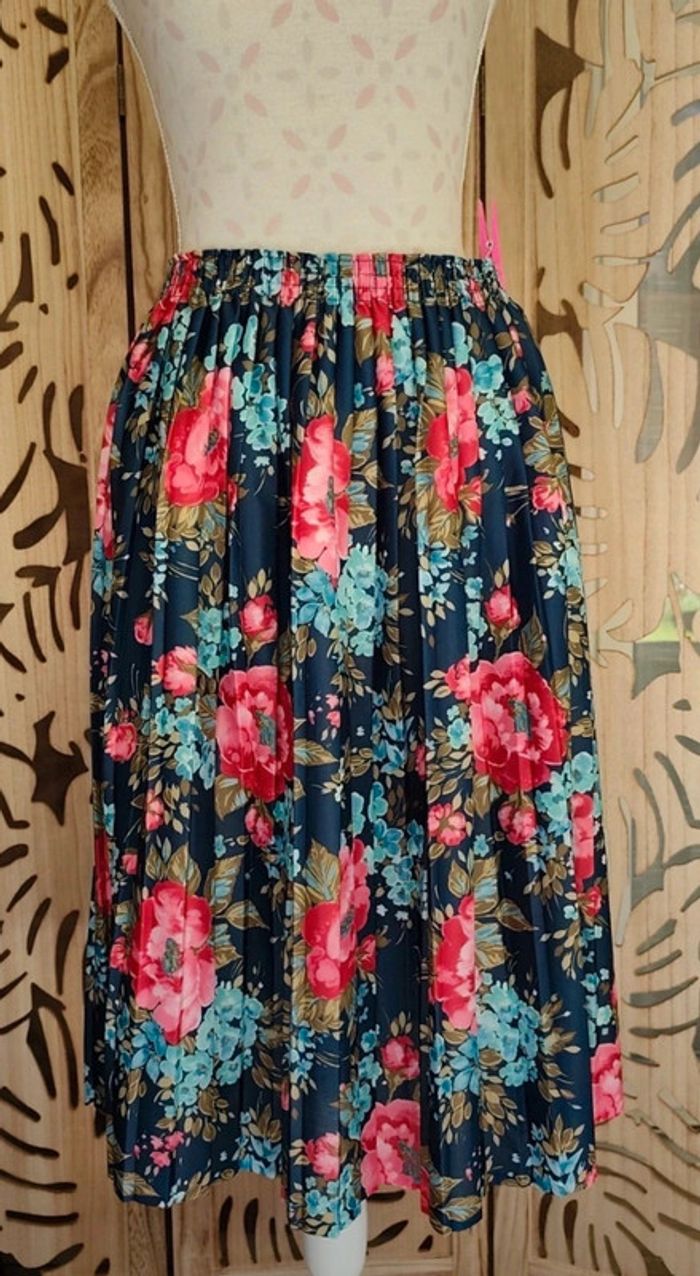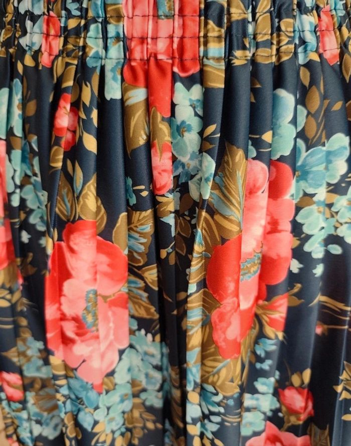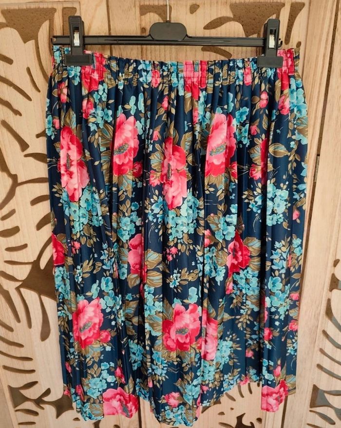 Jupe plissée imprimée fleurie Couleur bleu marine, turquoise, rose , Kaki Jupe sans doublure Taille 48 Taille à plat : 39 cm extensible jusqu'à 58 cm Matière : 100 % polyester Longueur : 70 cm