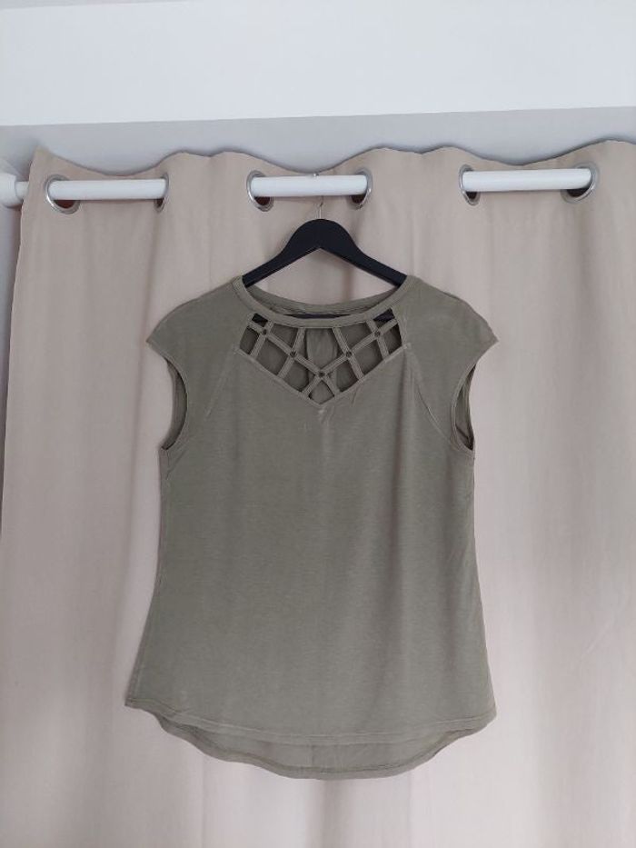 Joli top fluide kaki, sans manches, avec empiècement croisé à l'avant. Taille M / 38. Très bon état.