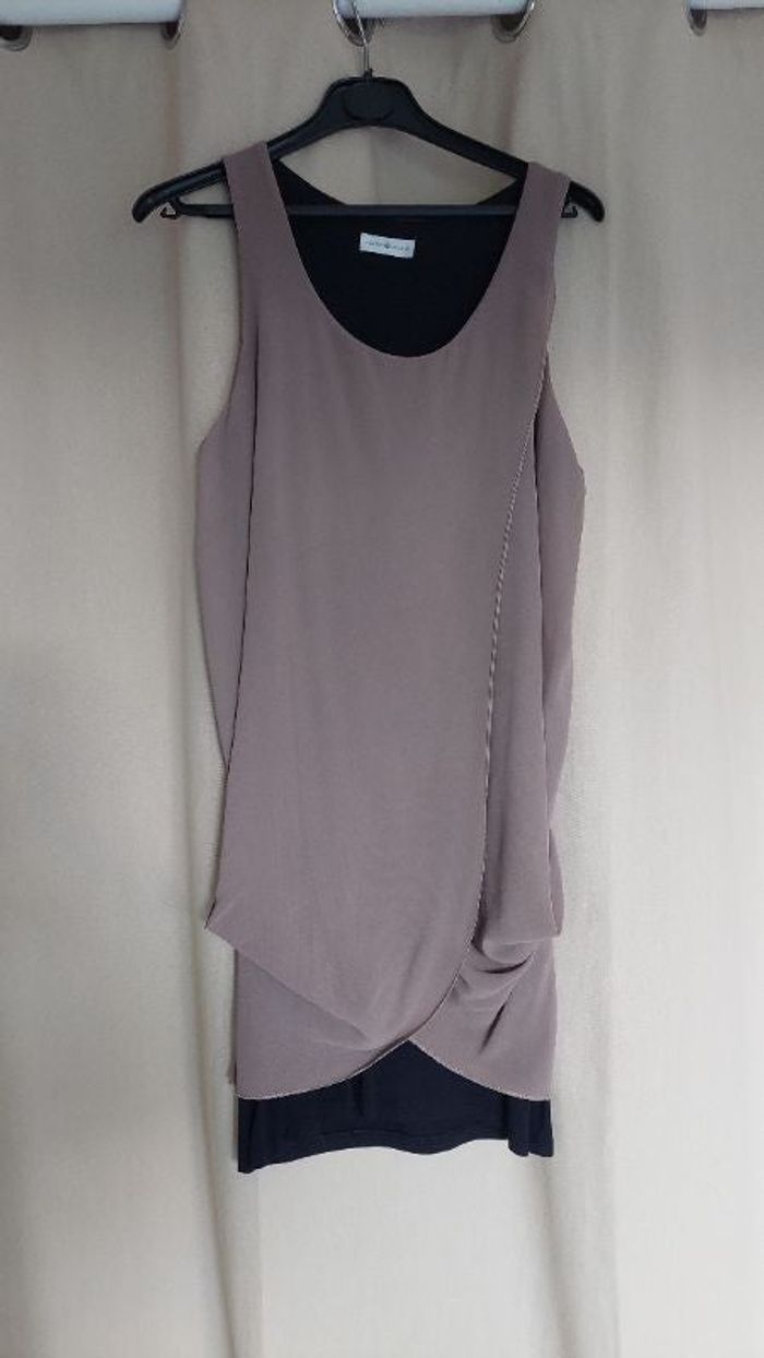 Robe noire moulante avec un voilage brun formé par 2 pans s'ouvrant sur l'avant. Marque Cache-Cache Taille 38 Très bon état