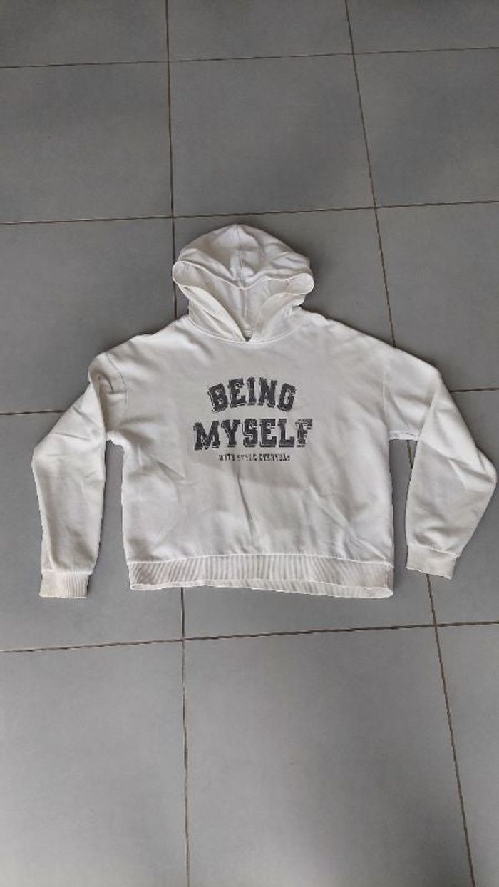 Sweat à capuche blanc, avec inscription grise à l'avant. Marque Kiabi Taille M / 38 En bon état général. Une légère tâche sur une manche et une autre vers l'épaule (cf. 2 dernières photos)