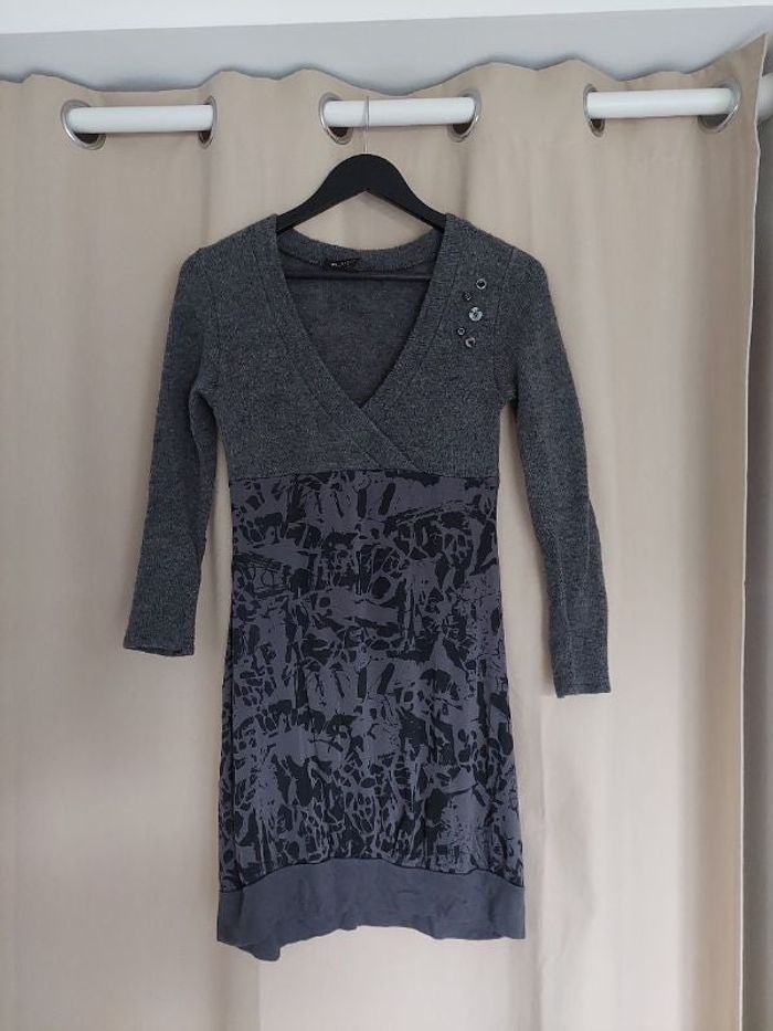 Belle robe-pull grise avec : - haut en laine et col en V, avec petits boutons d'ornement - bas en matière fluide, gris avec motifs noirs Très bon état