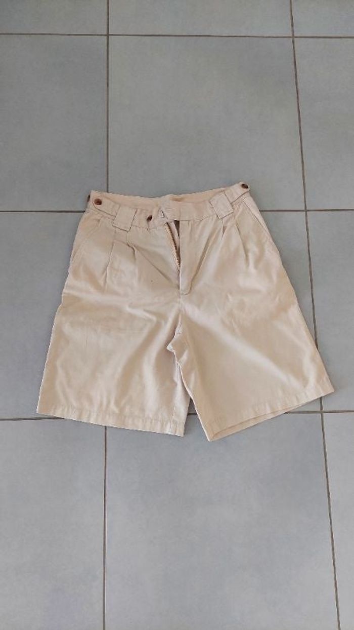 Short en toile beige, mi-long (arrive à mi-cuisse en mesurant 1,75m). Très féminin car pincé à l'avant. Réglable à la taille sur 2 positions Noté taille 38 sur l'étiquette mais taille petit, je recommande vraiment pour une taille S / 36 Très bon état. A noter toutefois, un très léger accroc au niveau de la ceinture (dû à la fermeture à l'arrière de l'accroc). cf. dernière photo.