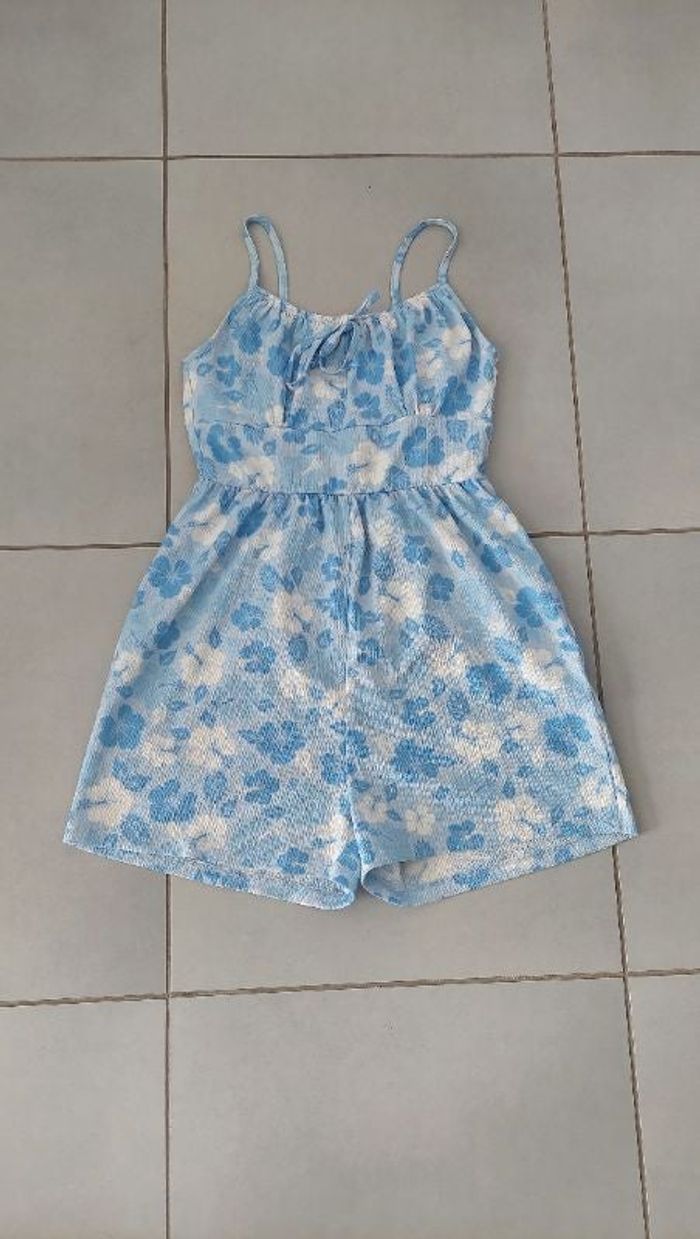 Joli combishort bleu clair et blanc avec motif fleuri. Elastiqué au niveau de la poitrine pour un bon maintien. Marque Primark, taille S / 36. En excellent état, comme neuf.
