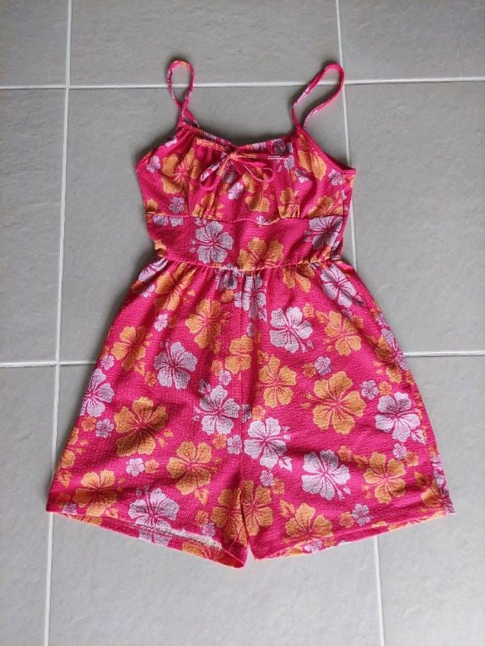 Joli combishort coloré fushia et orange avec motif fleuri. Elastiqué au niveau de la poitrine pour un bon maintien. Marque Primark, taille XS / 34. En excellent état, comme neuf.