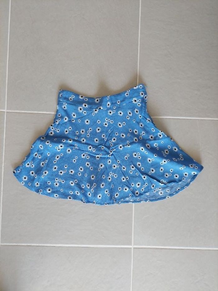 Très belle petite jupe courte évasée bleue avec fleurs blanches. Petit short intégré à la jupe du même colori pour ne pas avoir peur des coups de vent ! ;-) Très bon état. Marque Stradivarius Taille XS / 34 ou équivalent 16 ans