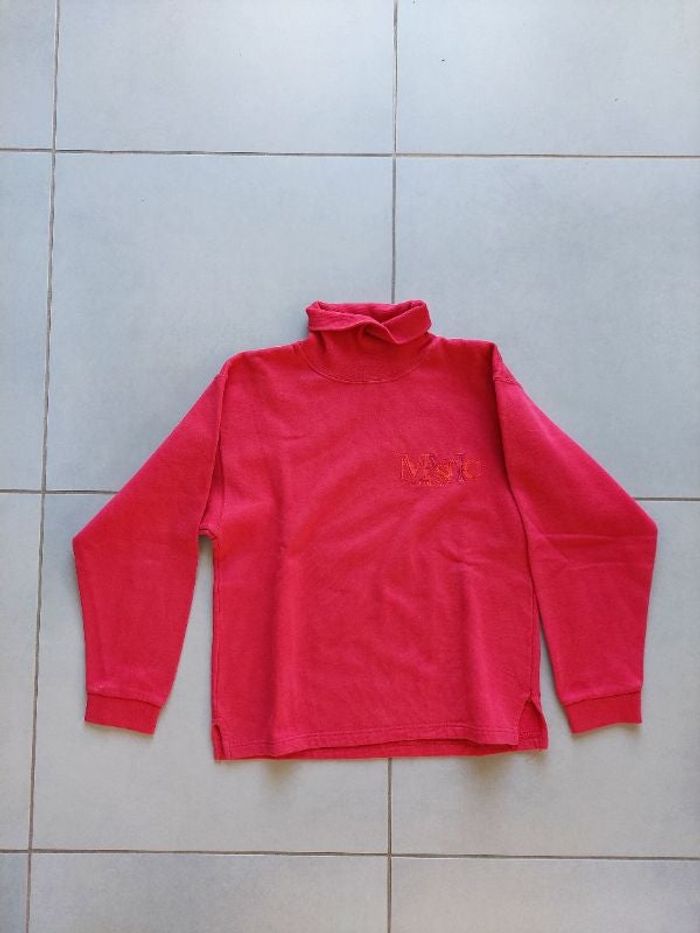 Sweat / pull à col roulé, couleur rouge, taille12 ans. La couture se défait légèrement en bas du pull + légère tâche au niveau de la manche (cf 2 dernières photos) Sinon, en très bon état.
