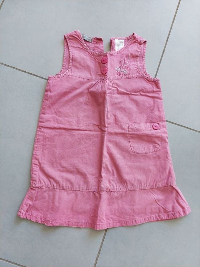 Robe rose, marque La Redoute, taille 24 mois. Peut-être portée telle quelle l'été ou avec un tshirt manches longues et des collants l'hiver. Très bon état