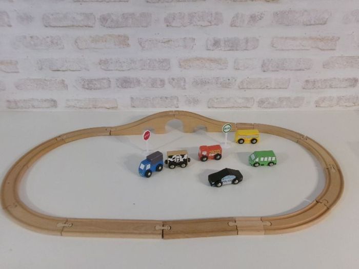 Circuit en bois de train ou de voiture en bon état. Vendu avec un camion de pompier, un bus, une voiture de police un camion avec un petit impact, un camion avec un wagon vaches. Mon dressing est trié par catégories, tailles et saisons pour les vêtements. #sonia222404 #jouetenfantsonia222404