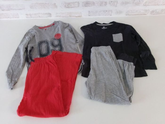 Pyjamas 6/8 ans hiver en bon état, le bas de pantalon rouge a besoin d'un peu de couture, le bleu a une petite tâche à côté de la poche.