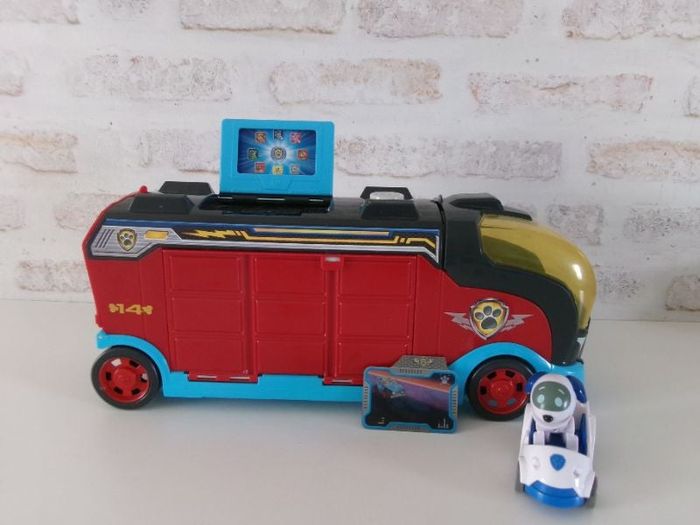 Camion Mission Cruiser Mighty Pups Pat Patrouille / Paw Patrol en bon état, un côté du camion avec des traces. Tout fonctionne parfaitement, lorsque l'ont appuie sur le bouton "patte" ceci lève l'écran du toit avec une carte double sens, fait ouvrir les portes du camion. De l'autre côté du camion, il y a des leviers pour faire descendre les véhicules. Vendu avec le chien robot et son véhicule. Mon dressing est trié par catégories, tailles et saisons pour les vêtements. #sonia222404 #jouetenfantsonia222404