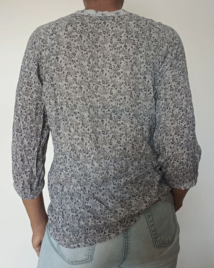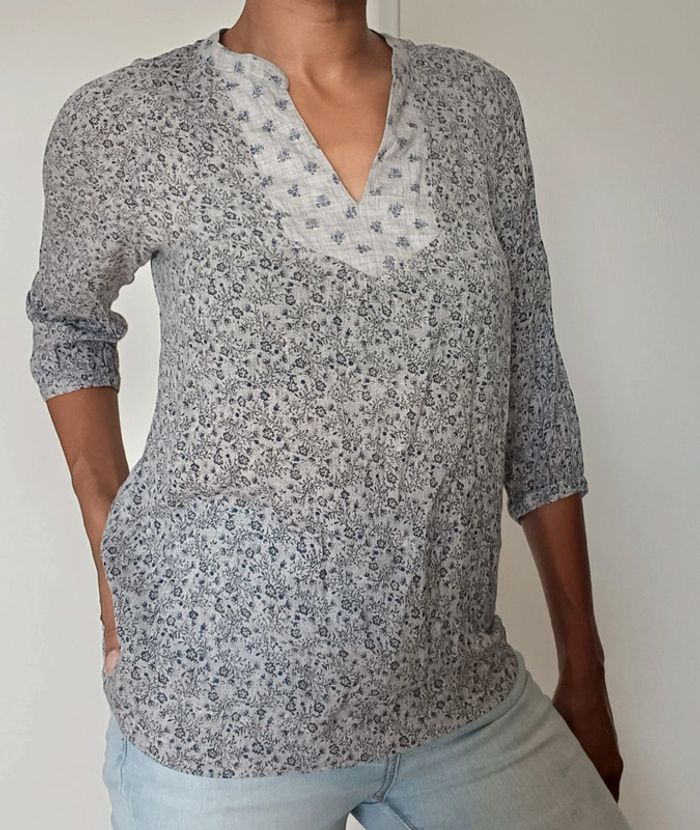 Chemisier manche 3/4 gris avec motif floral bleu marine de la marque Etam en très bon état, Taille 38