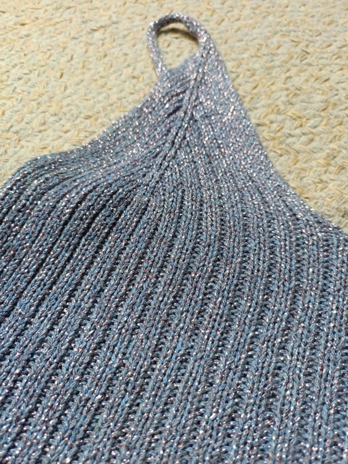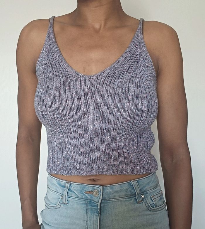 Débardeur court violet avec filament brillant, très bon état, matière extensible, Taille S-M