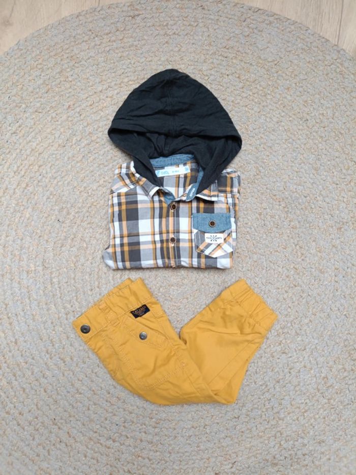 Ensemble chemise à carreaux / pantalon Chemise à carreaux avec capuche de la marque Gémo taille 12 mois, pantalon jaune de la marque tape à l'oeil taille 12 mois