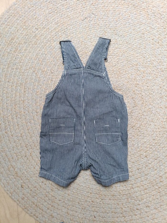 Ensemble salopette/polo, en très bon état, polo blanc de la marque Kiabi 9 mois, salopette en jean rayer bleu marine et blanc (short) de la marque Tex 9 mois