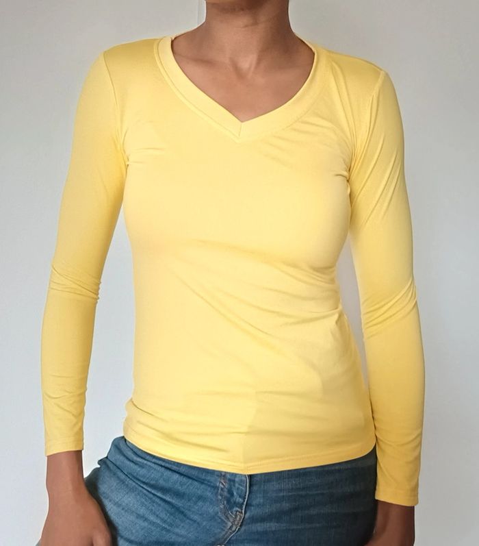 Haut manche longue, jaune, col V. Bon état. Peut porté