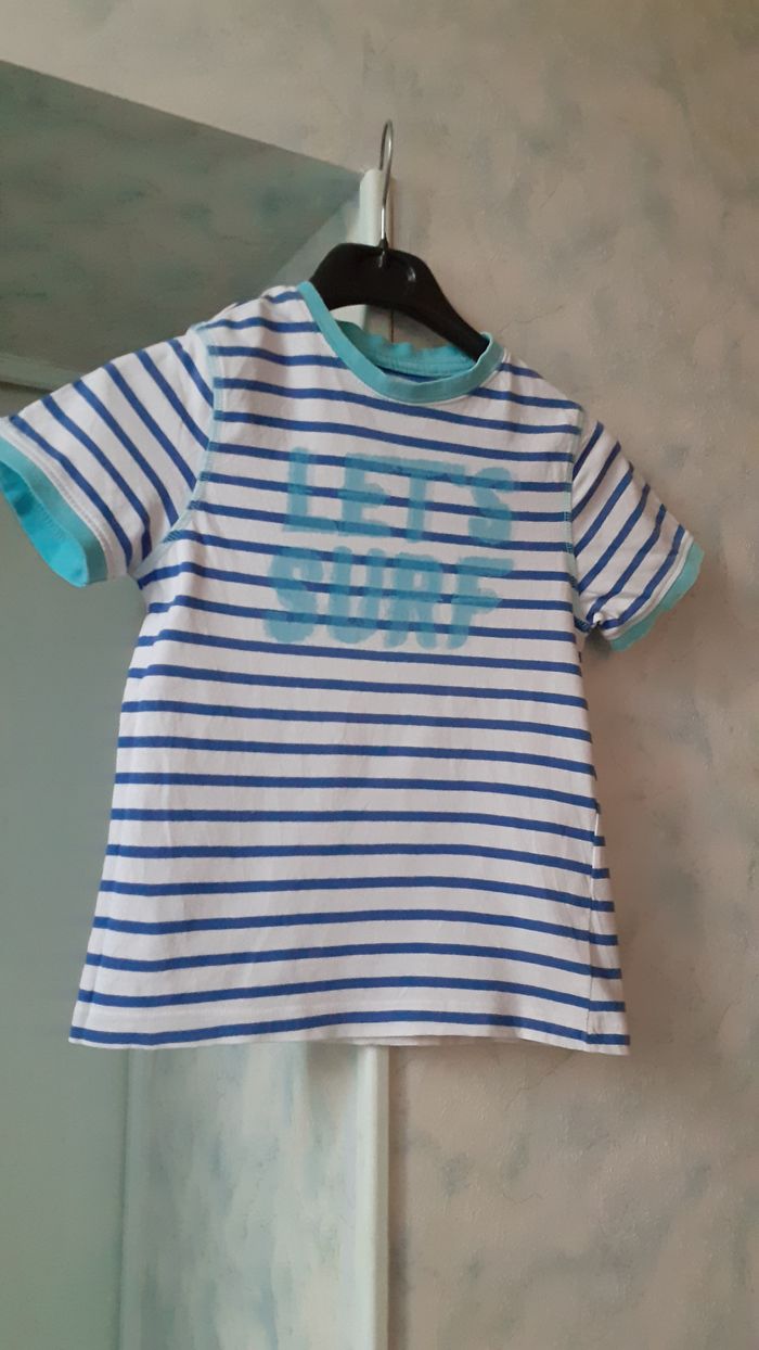 Vends un tee-shirt manches courtes 100 % coton, couleur blanc avec rayures bleu marine, inscriptions et bordures turquoise, marque Epop, taille 6 ans.