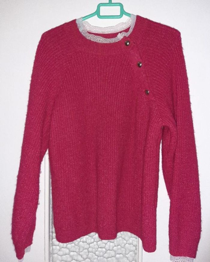 Pull taille L (42) couleur framboise qui n'est pas répertoriée dans le nuancier. Contour col et bas des manches dentelle blanche. Boutons dorés. Très chaud et très peu porté.
