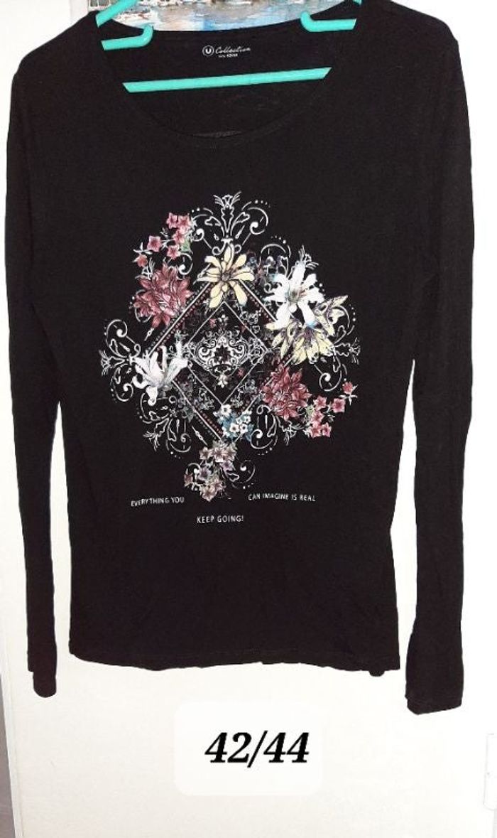Tee-shirt manche longue 42/44 Noir motif sur le devant. Viscose majoritaire. U Collection Largeur sous aisselles 50 Longueur 65