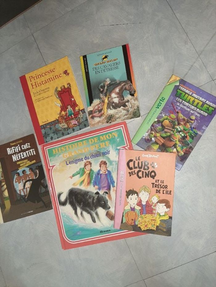 Rififi chez Néfertiti, princesse Histamine , Grand galop des cavaliers en détresse, Histoire de mon grand-père l'énigme du chien noir, le Club des Cinq et le trésor de L'île turtles les Tortues Ninja