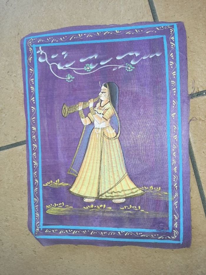 Parchemin à encadrer représentant une femme musicienne. Rapporté d'un voyage mais je ne sais plus de quel pays... 1 petit défaut en bas (dernières photos) dimension : 23,5 X 32