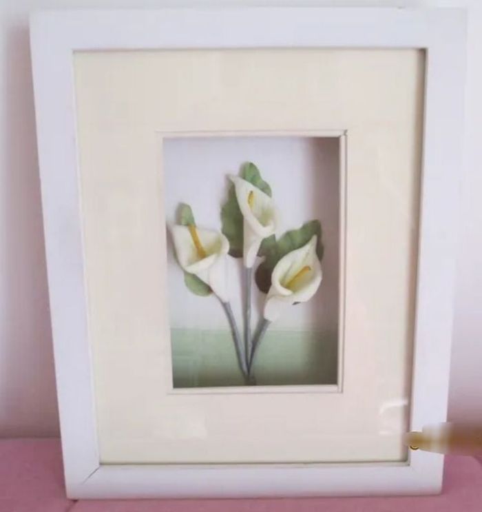 Tableau cadre blanc fond à fleurs 3 arums longueur 22 hauteur 27 profondeur 3,5