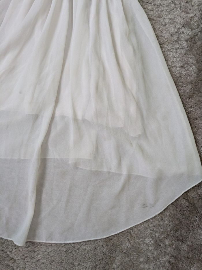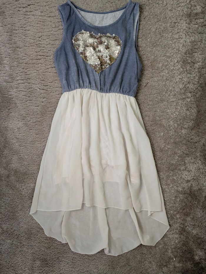 Jolie robe asymétrique, le haut est style jean avec cœur en sequin réversible, la jupe en voile avec jupon, légèrement tachée derrière (voir dernière photo)