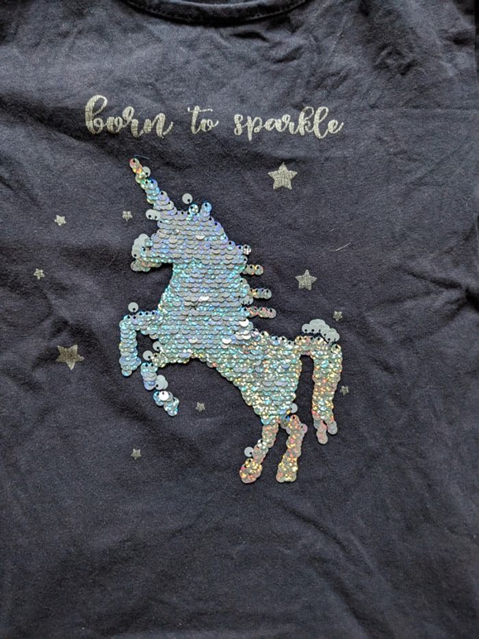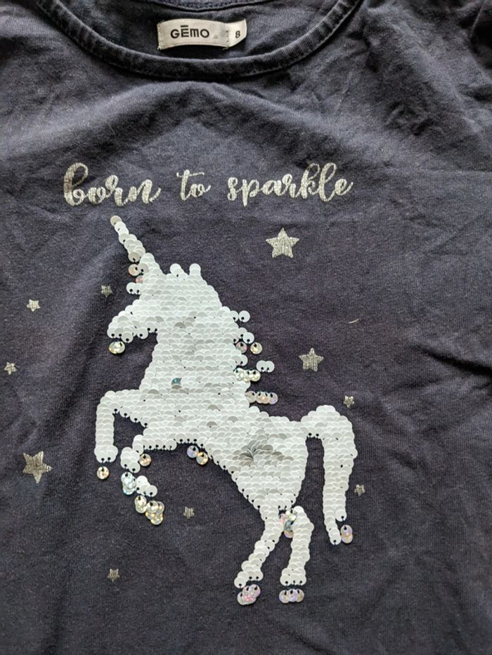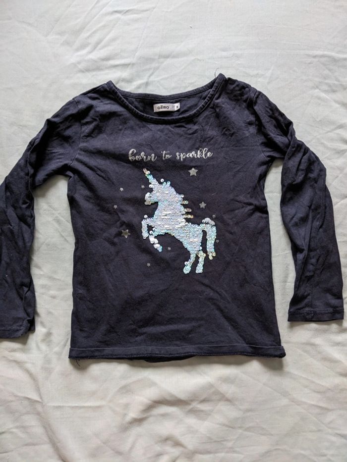 Tee-shirt manches longues licorne en sequin réversible, marque gemo, taille 8 ans, en bon état juste deux petits trous au niveau de l'étiquette au dos (voir dernière photo) Réduction sur les lots Merci d'éviter les envois par vinted go