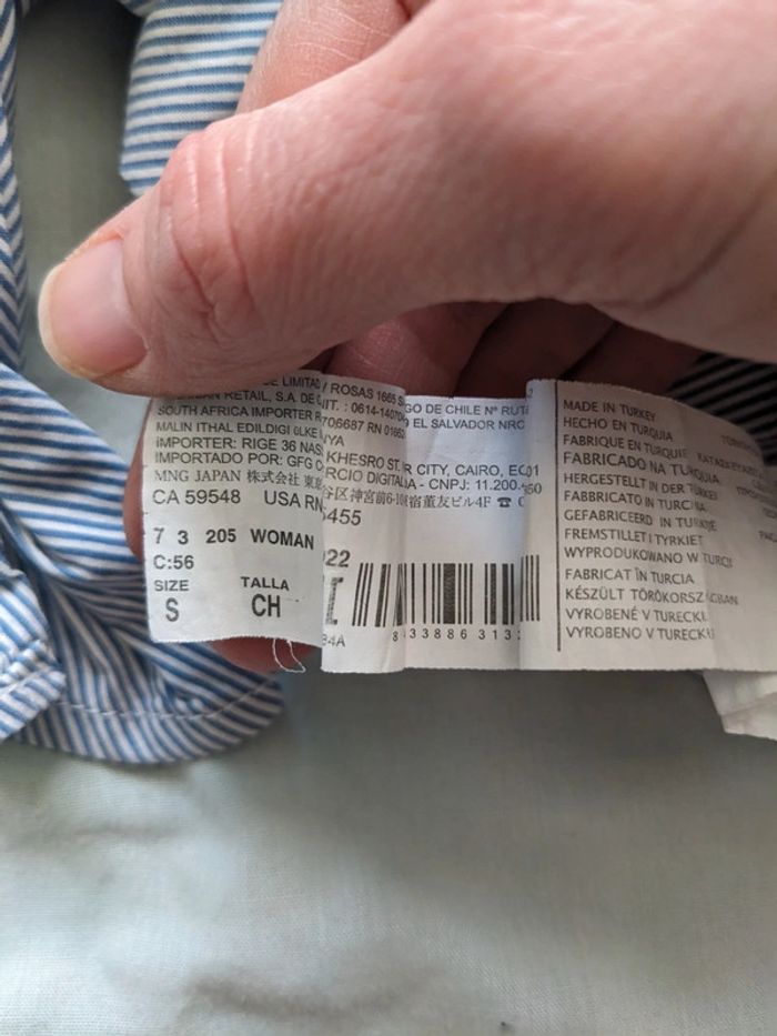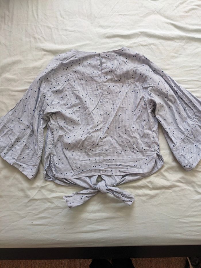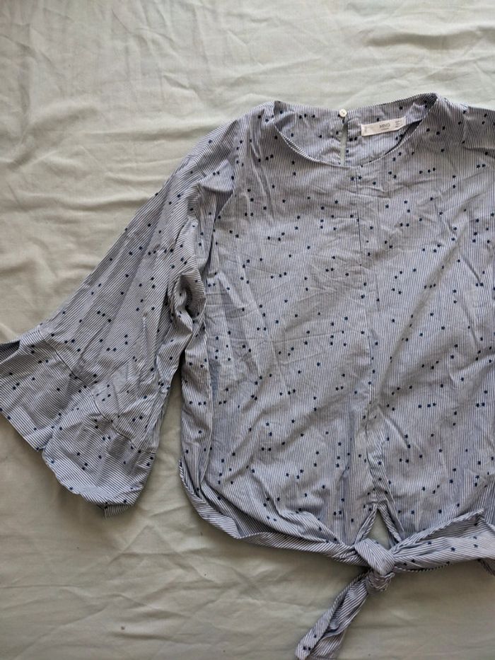 Joli chemisier court mango, manches évasées et noeud sur le devant, rayé bleu et blanc avec petites étoiles, taille S Très bon état Réduction sur les lots Merci d'éviter les envois par vinted go