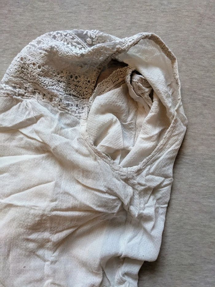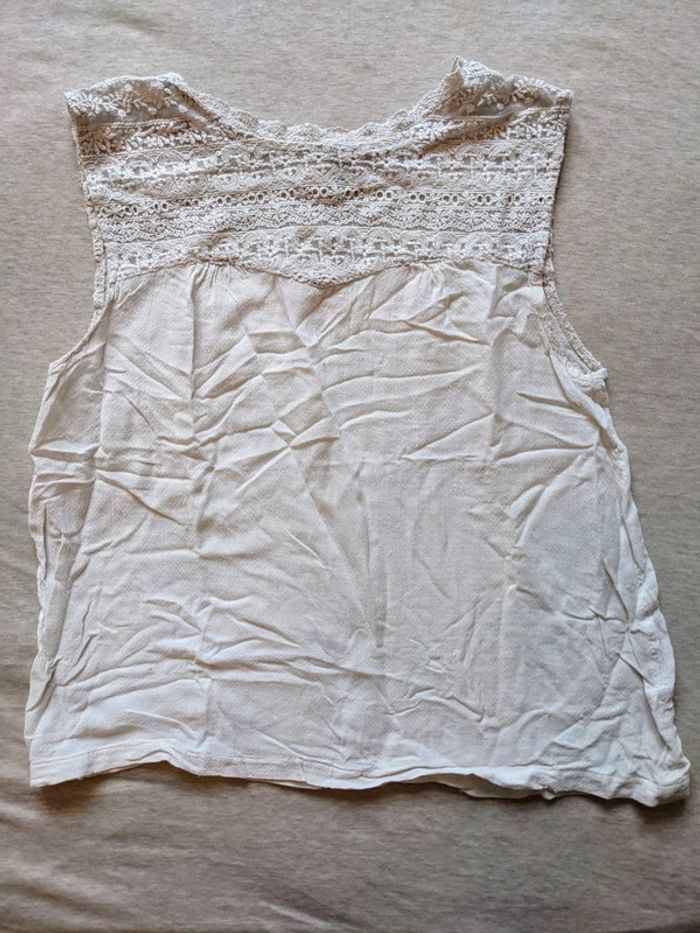 Joli débardeur taille S avec bande en dentelle sur le devant, porté mais encore en bon état, légèrement marqué au niveau des aisselles (voir dernière photo) Réduction sur les lots Merci d'éviter les envois par vinted go
