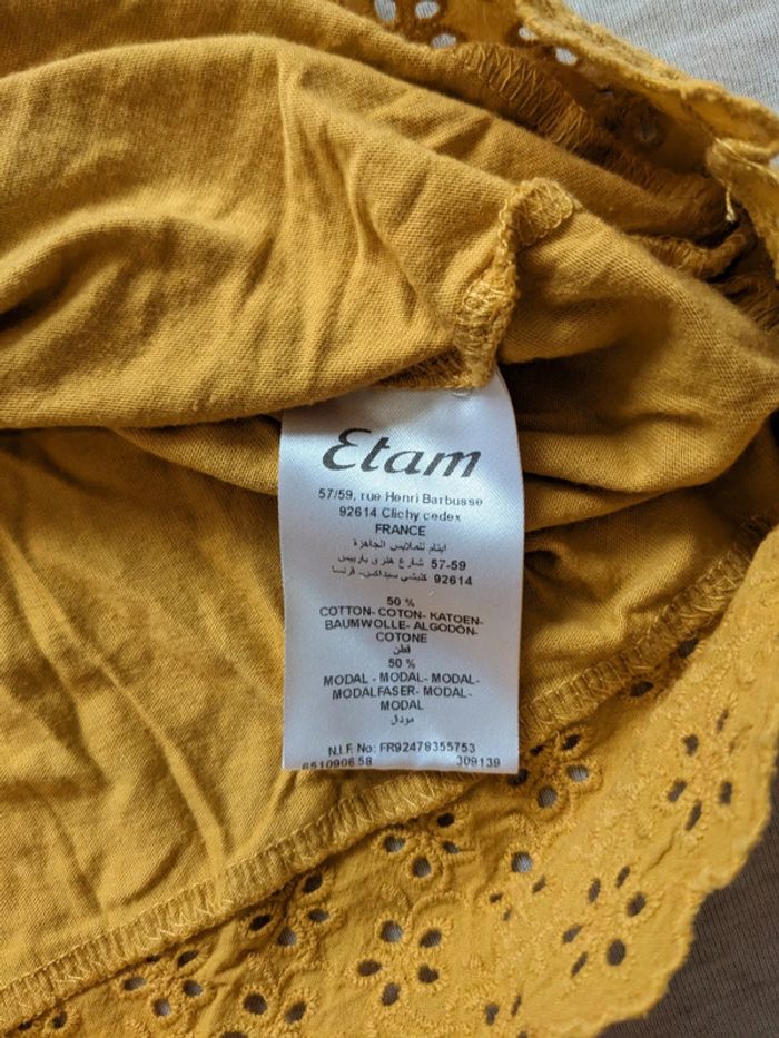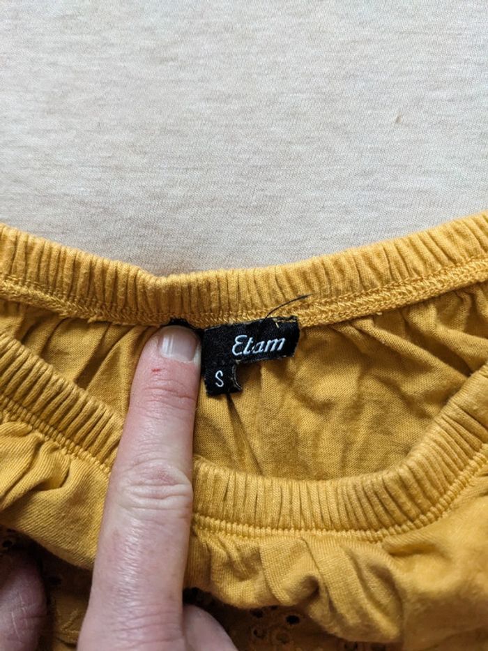 Joli haut etam jaune moutarde, à porter épaules nues ou pas, avec broderies Très bon état Réduction sur les lots Merci d'éviter les envois par vinted go