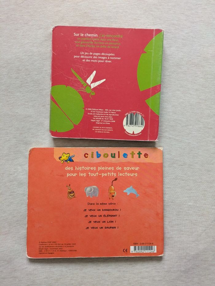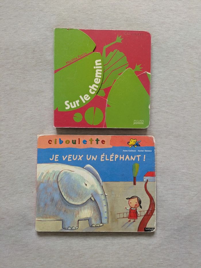 Deux livres cartonnés pour les petits, sur le chemin pour découvrir les animaux cachés et je veux un éléphant Les couvertures sont un peu abîmées mais l'intérieur est en bon état Réduction sur les lots Merci d'éviter les envois par vinted go