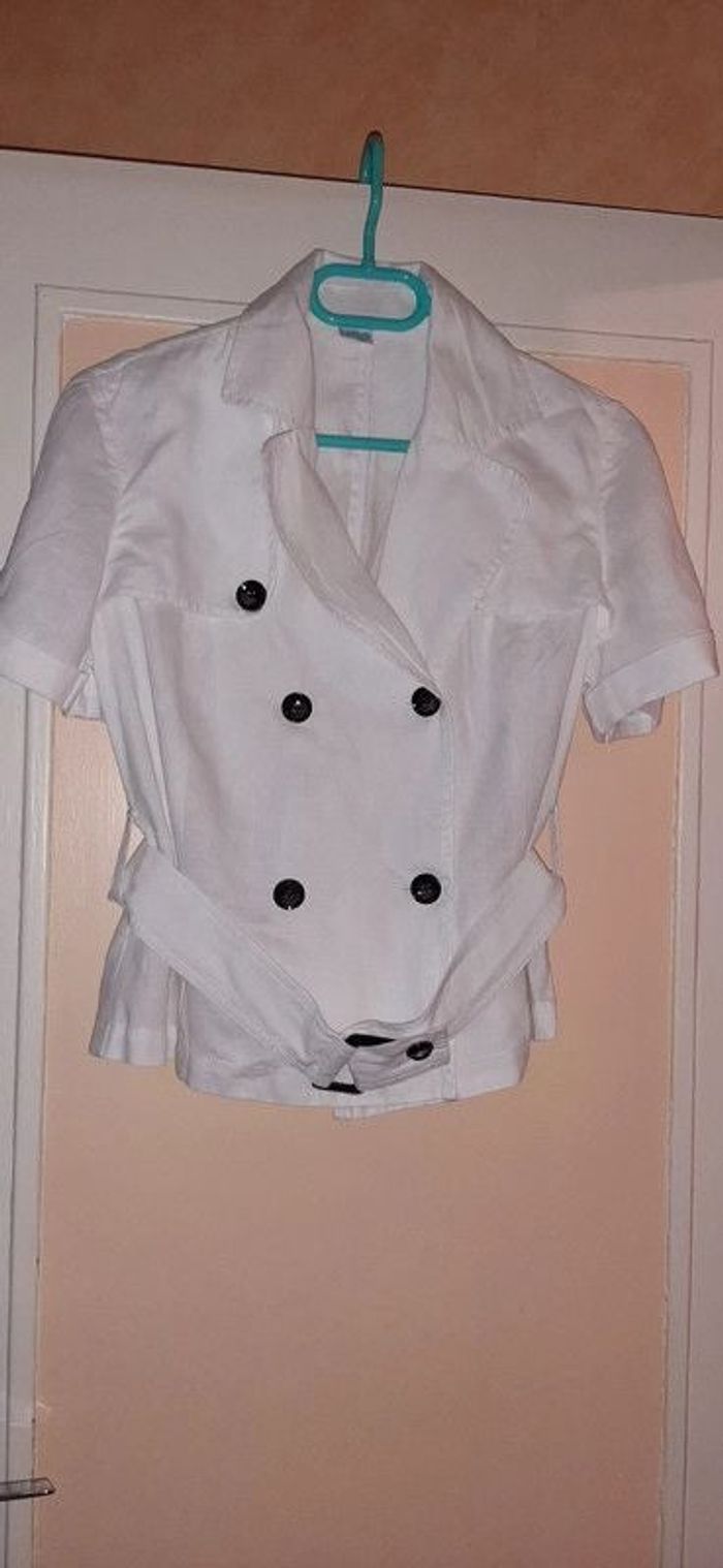 Veste blanche Camaïeu. Lin . Taille 44 longueur du haut de l'épaule 55 cm. longueur sous aisselle 40 cm Ceinture Boutonnage Petite fente arrière Parfait état (portée une journée pour une cérémonie).