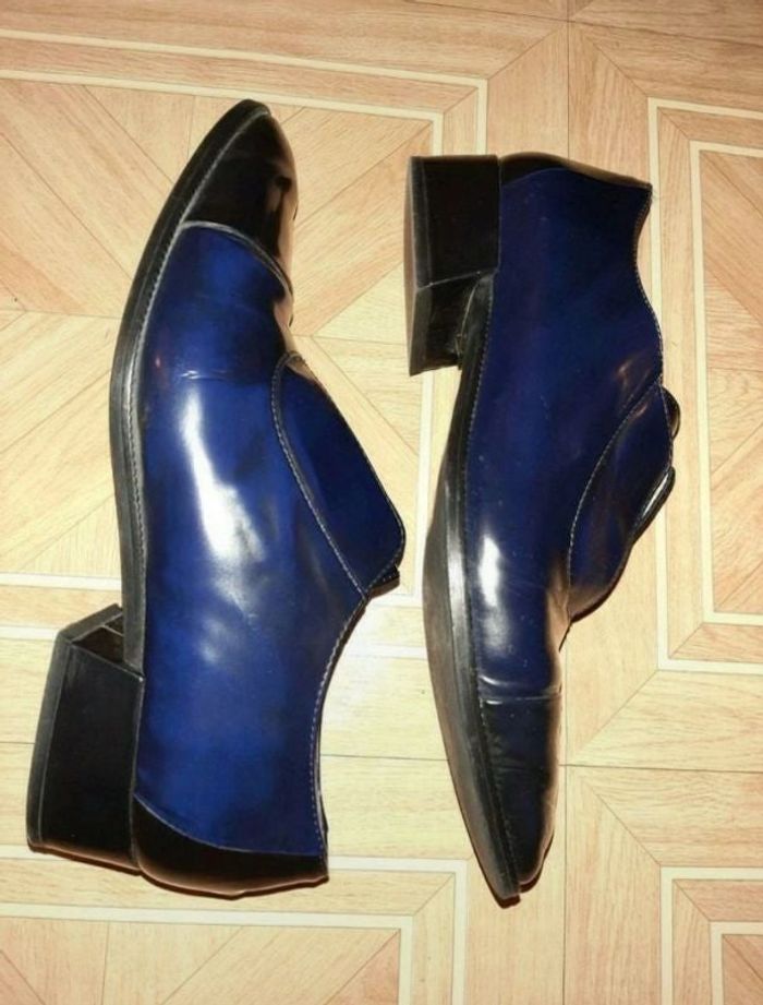 STATUS 39. Mocassin cuir. Fabrication italienne Cuir lisse intérieur, extérieur. Cuir lisse brillant noir et bleu marine (noir pour la pointe, l'arrière du talon et le talon) (intérieur extérieur très propres) La languette sur l'intérieur, permet de donner plus d'aisance sur le dessus du pied. Marque de qualité.