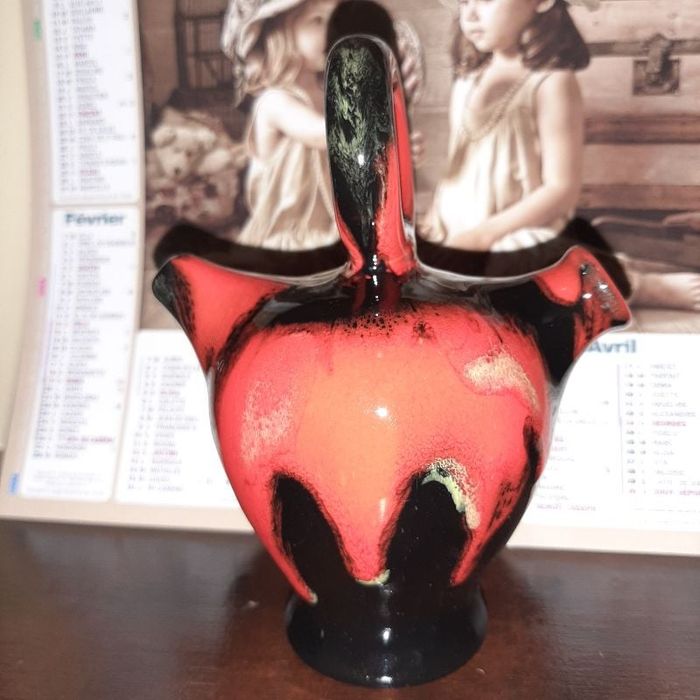 Petit récipient céramique rouge et noir brillant. Décoratif, utilisable pour 2 petites fleurs. Style méditerranéen.