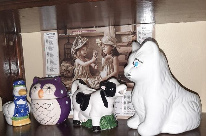 1 vache, 1 canard, 1 chouette, 1 chat. Céramique. Creusés pour y ranger petits bijoux par exemple.. La chouette contenait 1 bougie parfumée.