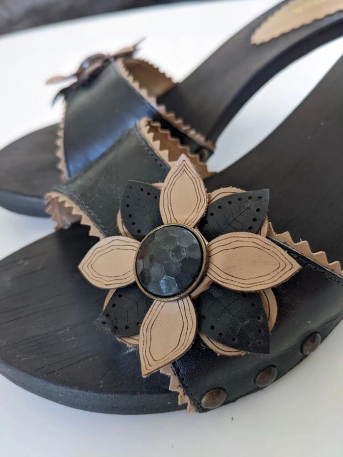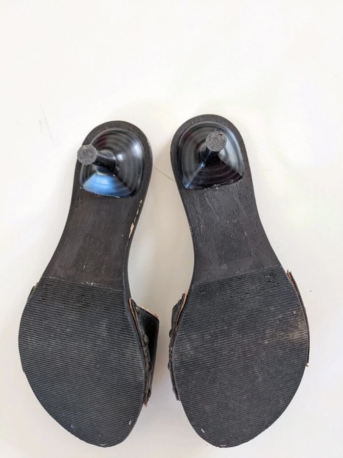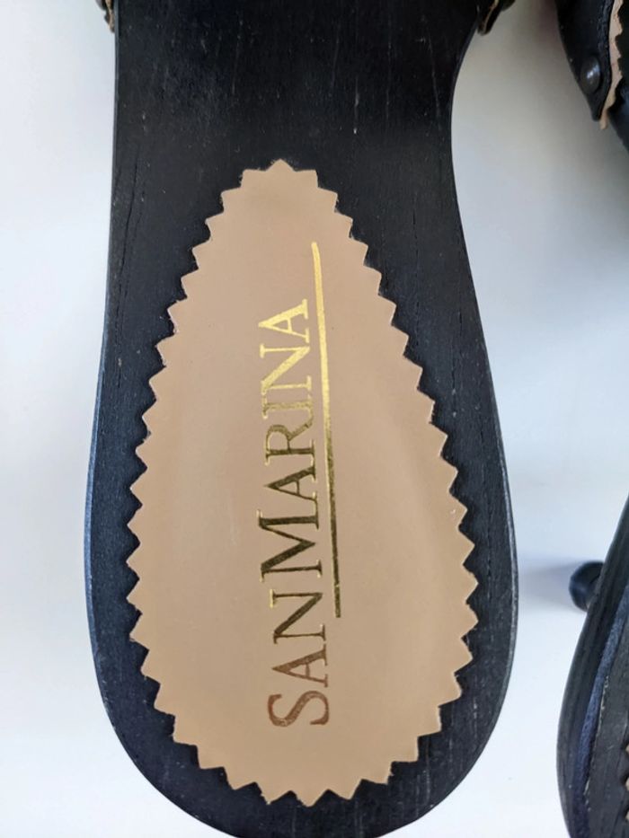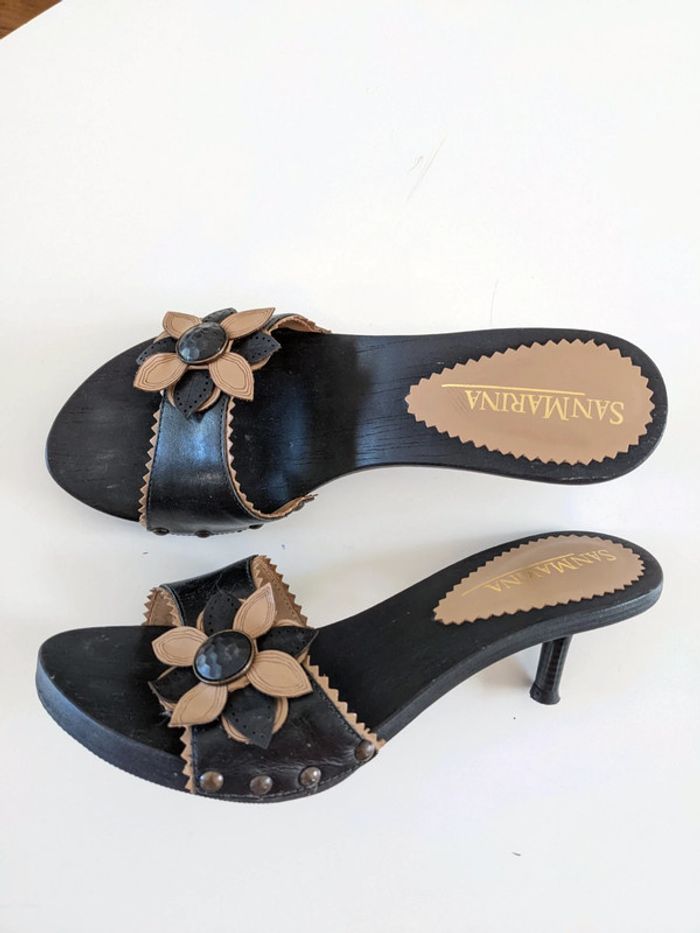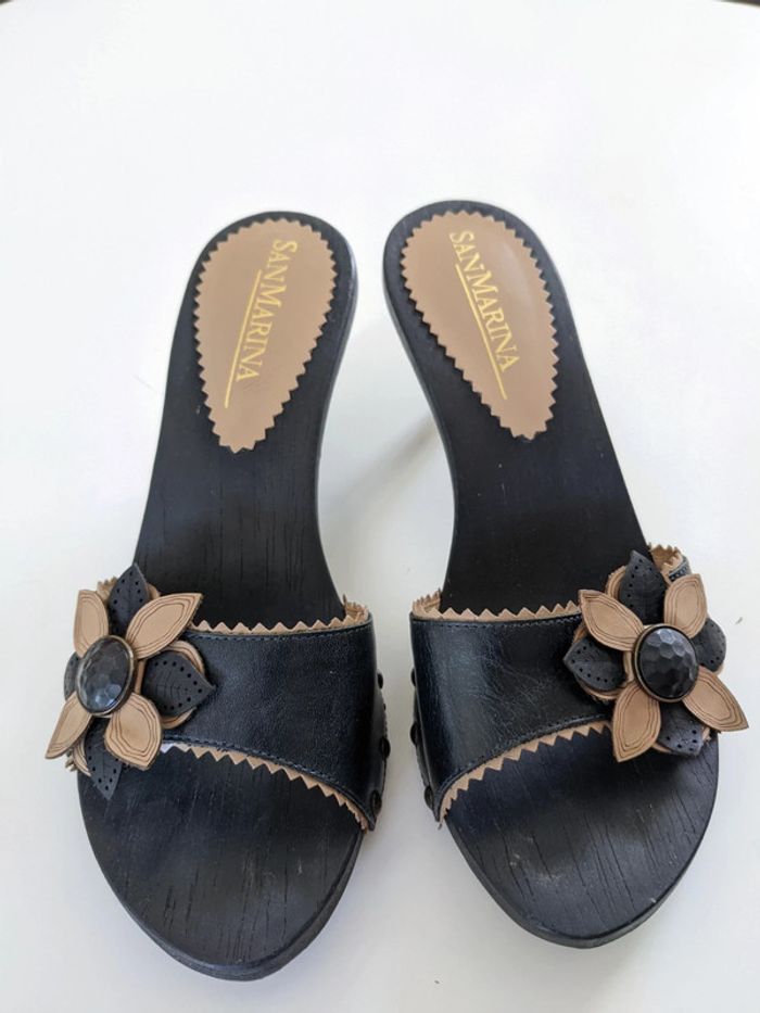 Jolies mules San Marina à talons aiguilles, semelles en bois, portées une fois, très bon état Réductions sur les lots