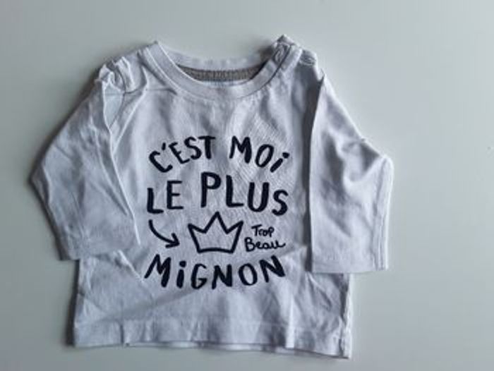 Haut à manches longues blanc avec inscription. Exellent état Taille : 3 mois Aux choix dans mon dressing , 5 articles pour 8 euros sur tous les vêtements