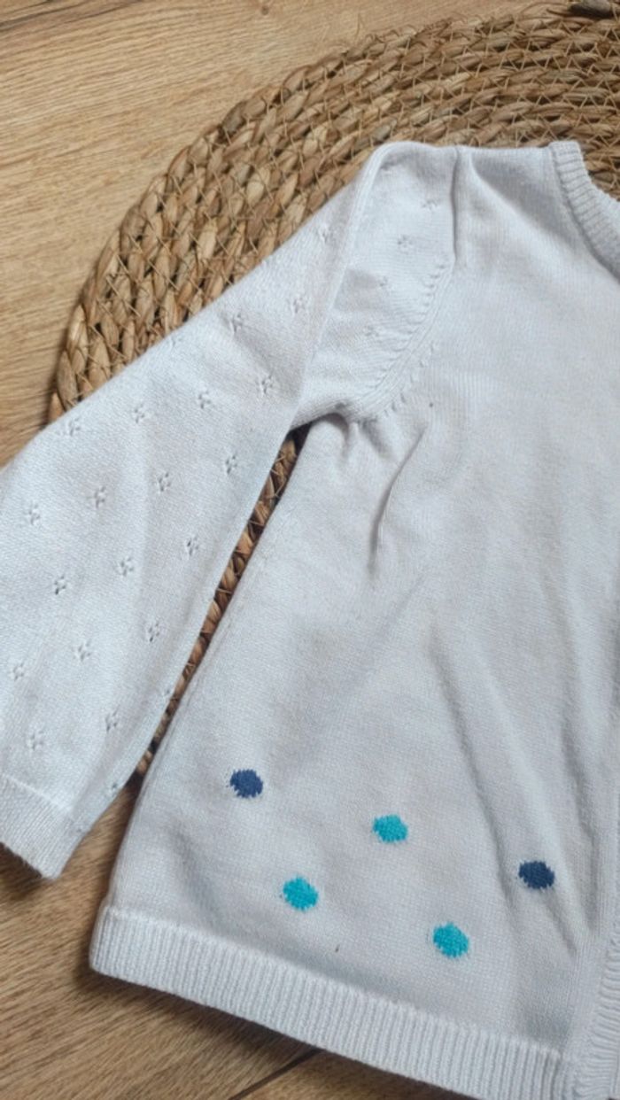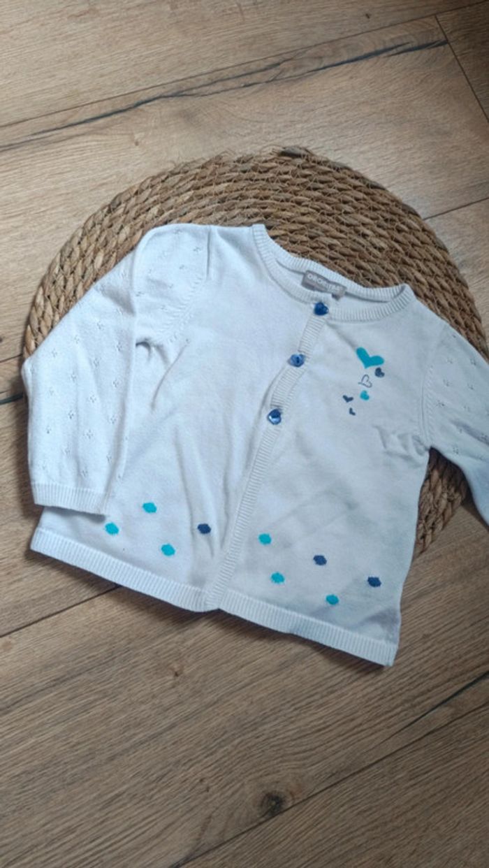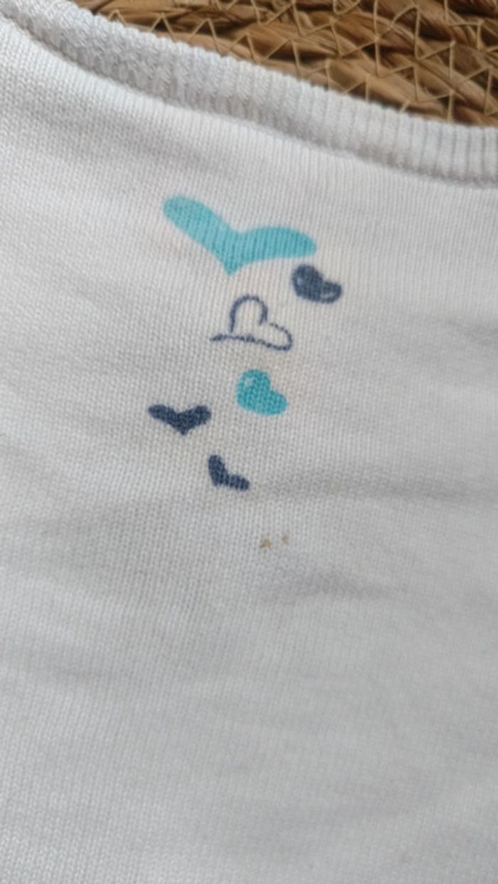 Je vends ce gilet blanc a motif bleu. Bouton en forme de coeur sur le devant. Orchestra 18 mois 81cm. Une tâche dans le dos voir dernière photo. #ptitang011_fille18mois
