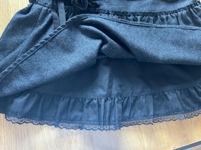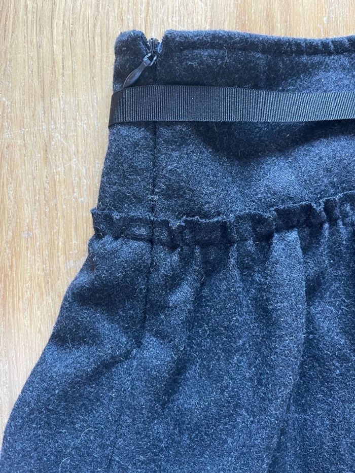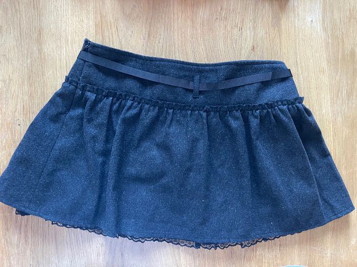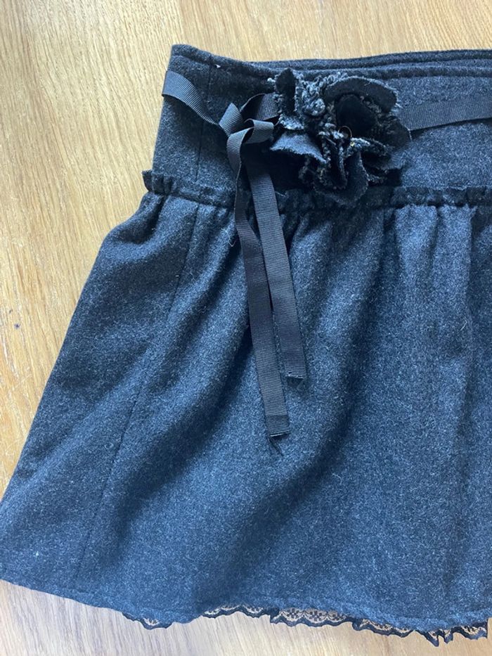 Mini jupe façon écolière 66%laine avec une doublure en coton et finition dentelle Fermeture sur le côté Ceinture fine et fleur à la taille Couleur grise Excellent état Triste de m’en en séparer mais trop petite