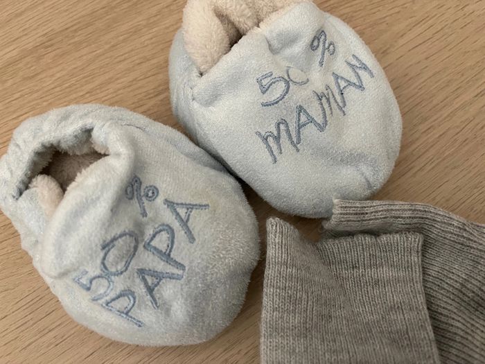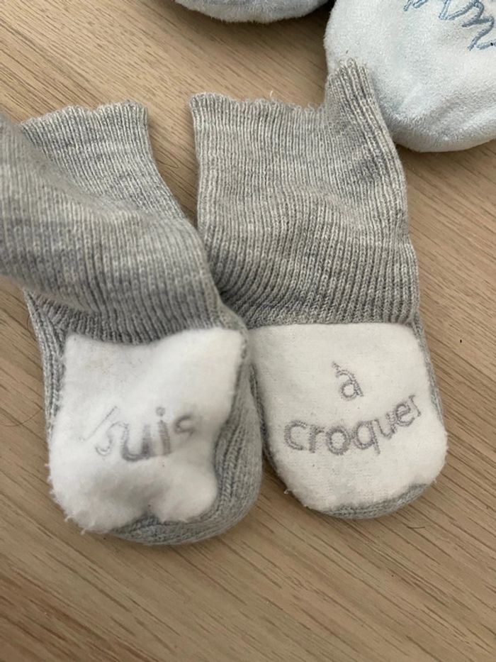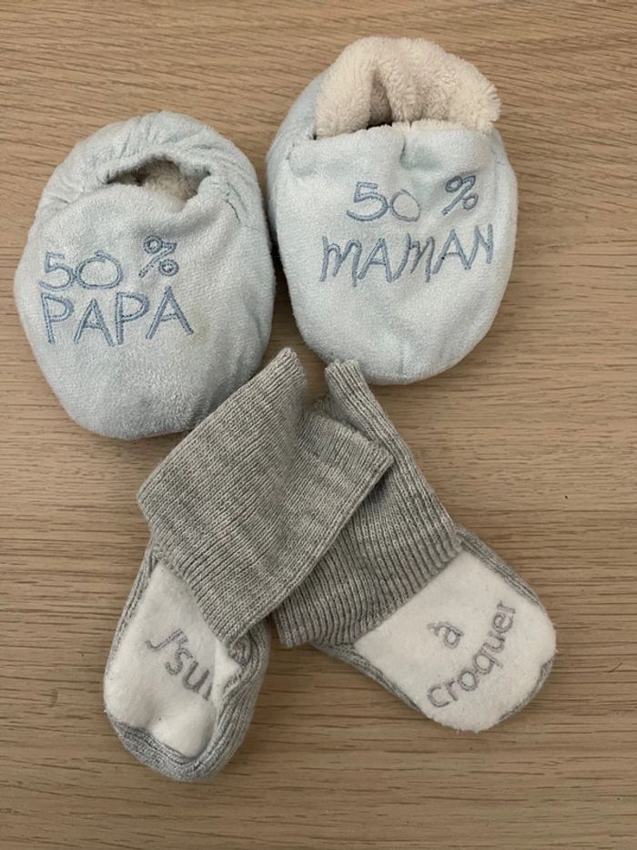 Chaussons bleus 50% maman/ 50% papa Chaussons/chaussettes blanc et gris « j’suis à croquer » Pour nouveau né